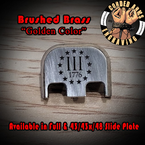 Tags: glock, glock slide plate, custom slide plate, custom glock slide plate, laser engraved slide plate, laser engraved glock slide plate, custom laser engraving, custom clock engraving, Brass, 3%ers, 3%