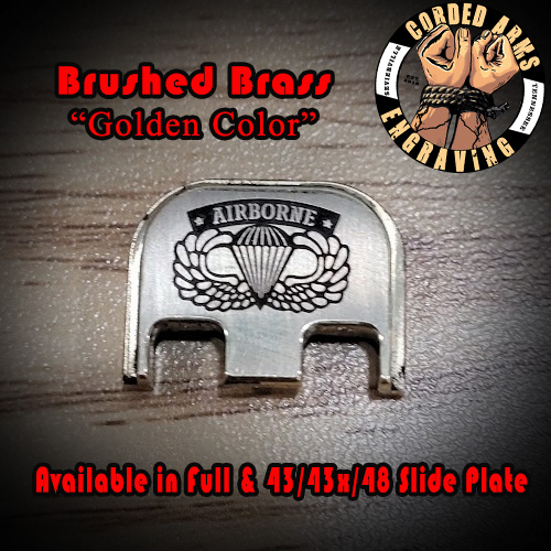 Tags: glock, glock slide plate, custom slide plate, custom glock slide plate, laser engraved slide plate, laser engraved glock slide plate, custom laser engraving, custom clock engraving, Airborne Jump Wings, military