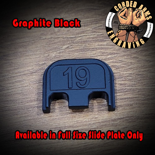 Tags: glock, glock slide plate, custom slide plate, custom glock slide plate, laser engraved slide plate, laser engraved glock slide plate, custom laser engraving, custom clock engraving, Blacked Out 19