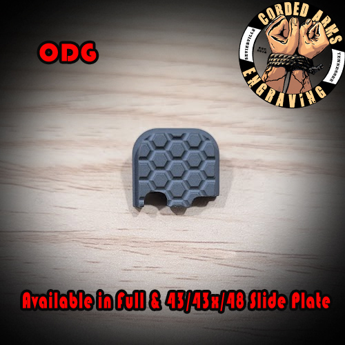 Tags: glock, glock slide plate, custom slide plate, custom glock slide plate, laser engraved slide plate, laser engraved glock slide plate, custom laser engraving, custom clock engraving, Knurl, cnc milling, Honeycomb CNC Milled Glock Slide or Base Plate