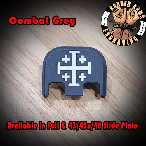 Tags: glock, glock slide plate, custom slide plate, custom glock slide plate, laser engraved slide plate, laser engraved glock slide plate, custom laser engraving, custom clock engraving, Jerusalem Cross, cross