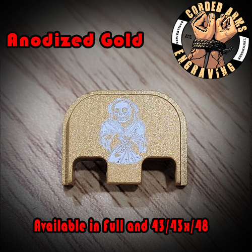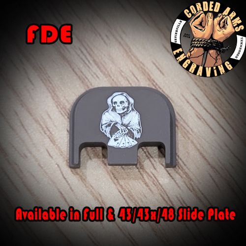 Tags: glock, glock slide plate, custom slide plate, custom glock slide plate, laser engraved slide plate, laser engraved glock slide plate, custom laser engraving, custom clock engraving, Playing with Death, Aces & Eights, dead mans hand