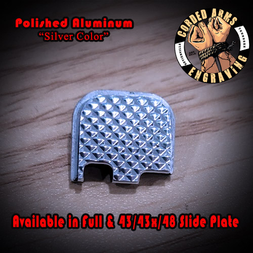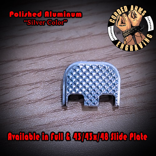 Tags: glock, glock slide plate, custom slide plate, custom glock slide plate, laser engraved slide plate, laser engraved glock slide plate, custom laser engraving, custom clock engraving, Knurl, cnc milling, Polished Aluminum Knurl CNC Milled Glock Slide Plate