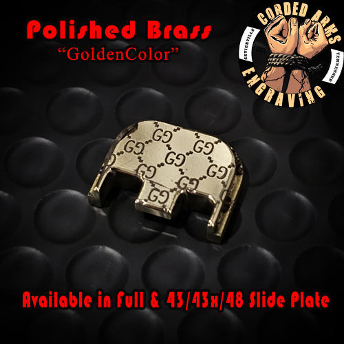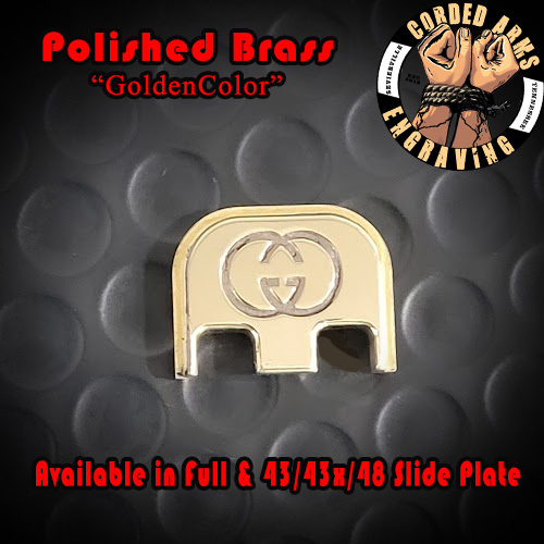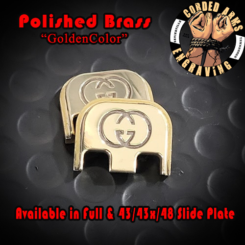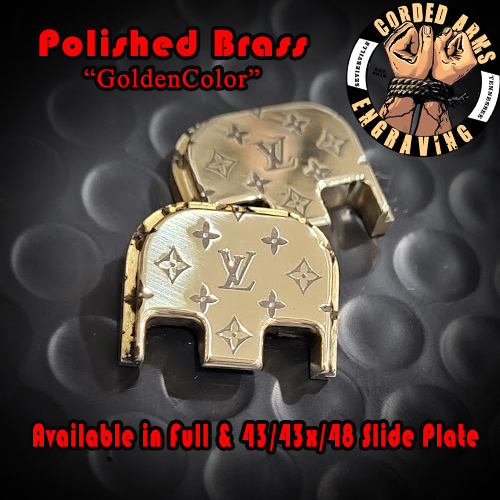 Tags: glock, glock slide plate, custom slide plate, custom glock slide plate, laser engraved slide plate, laser engraved glock slide plate, custom laser engraving, custom clock engraving, LV or Guicci slide plate, lv plate, polished lv slide plate, brass lv slide plate, titanium slide plate, brass, titanium, ti, polished