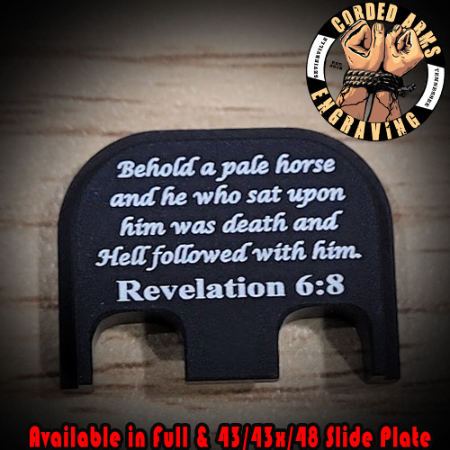 Tags: glock, glock slide plate, custom slide plate, custom glock slide plate, laser engraved slide plate, laser engraved glock slide plate, custom laser engraving, custom clock engraving, Revelation 6:8, christian, bible verses