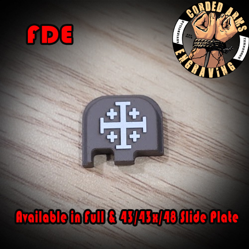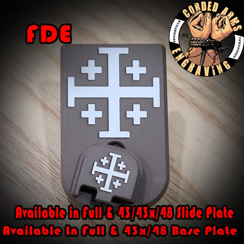 Tags: glock, glock slide plate, custom slide plate, custom glock slide plate, laser engraved slide plate, laser engraved glock slide plate, custom laser engraving, custom clock engraving, Jerusalem Cross, cross