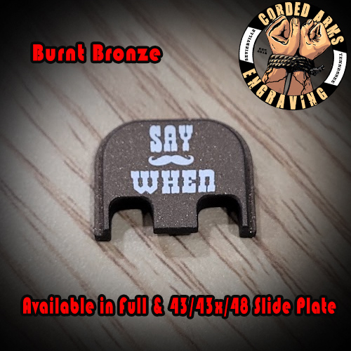 Tags: glock, glock slide plate, custom slide plate, custom glock slide plate, laser engraved slide plate, laser engraved glock slide plate, custom laser engraving, custom clock engraving, Say When