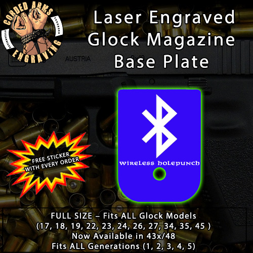 Tags: Wireless Holepunch, Glock base plate, glock, glock floor plate, magazine plate, glock magazine plate, laser engraved floor plates, laser engraved glock base plates, glock plates engraved, glock parts, custom glock engraving, custom glock,