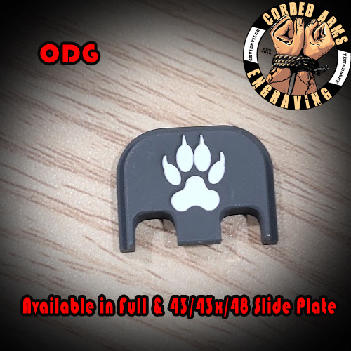 Tags: glock, glock slide plate, custom slide plate, custom glock slide plate, laser engraved slide plate, laser engraved glock slide plate, custom laser engraving, custom clock engraving, Wolf Paw